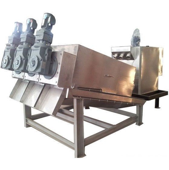 Volute dewatering press pertains to spiral extrusion machine, which can improve desilter and sludge thickener, and save construction cost of exhaust water factory. The machine replaces automatic update for filtration of filter mass for traditional sieving filteration. Consecutive separation of water and sludge is realized efficiently. Extrusion and dehydration of sludge is carried out via strong force resulting from the change of spiral spindle diameter and screw pitch, as well as tiny gap between float ring and fixing ring. Sludge is concentrated by gravity at concentration system before transferred to dehydration system. During delivery, filtration gap and screw pitch get smaller, and internal pressure is produced with resistance of back pressure plate and volume is reduced, thus realizing extrusion and dehydration.